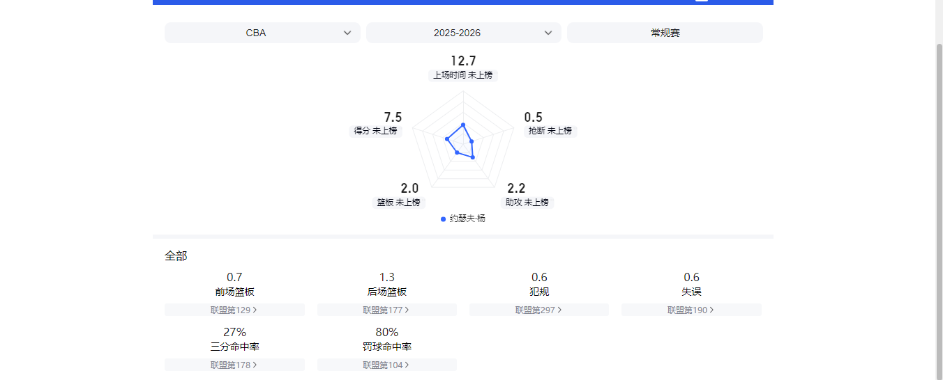 高阶数据方面,他的每百回合有效率命中率、三分命中率仅超过了19%、17%的同位置球员,他这样的表现有失外援水准。